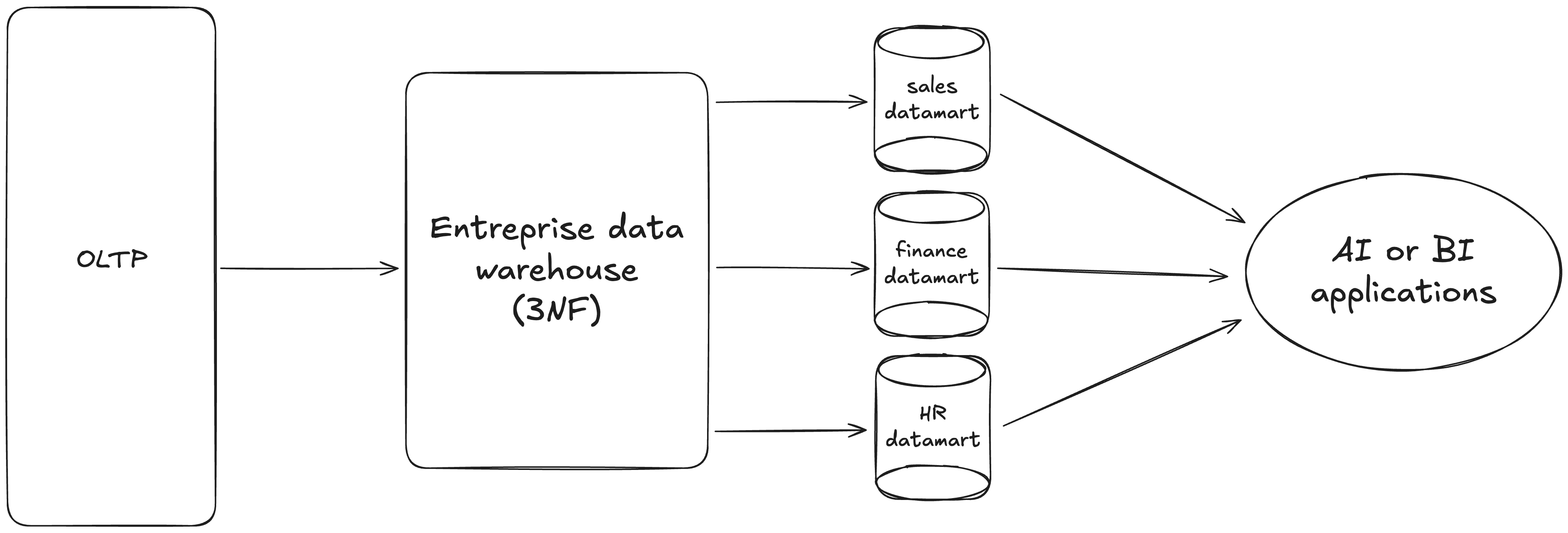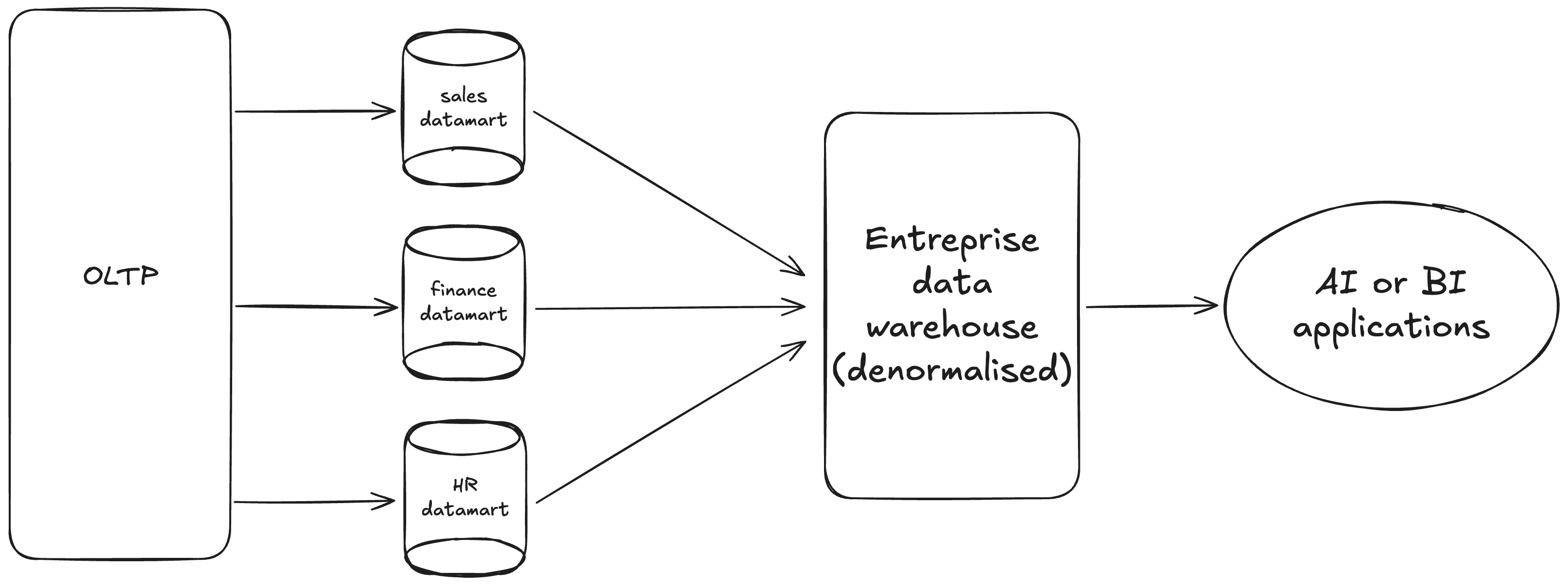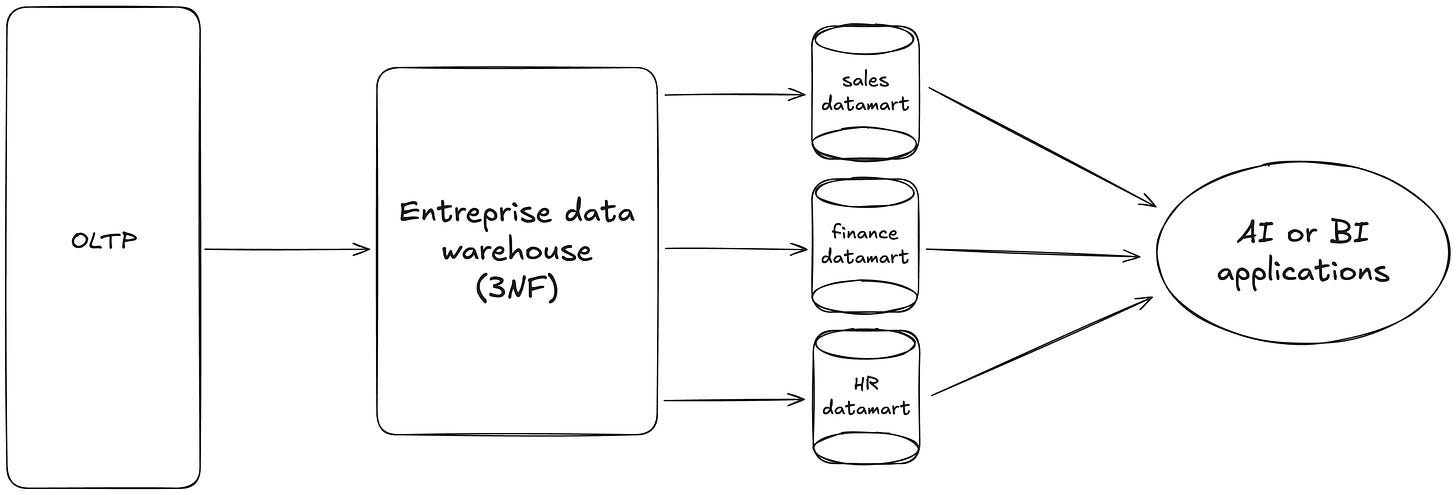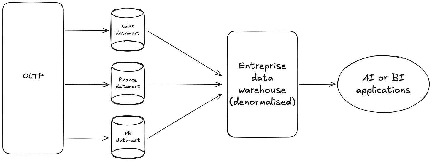 Inmon’s approach was introduced by Bill Inmon known as the “Father of data warehousing” in 1992 through his book '“Building the Data Warehouse”. As shown in the schema below, the core of this approach is to build an Enterprise Data Warehouse (EDW) from OLTP systems. The purpose is to fully normalise the EDW that is to say, ensuring no redundant data at the company level. Once the EDW is built, data marts are created to serve specific business needs or departments. From these data marts, AI or BI applications can be done. The purpose of this approach is to provide a single, consistent source of truth for all use cases across the organisation.