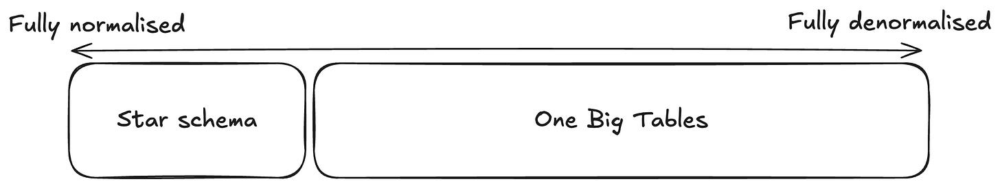 OBT are not the opposite of star schema. Rather, they are complementary. To get the best data layer as a back-end of analytical use cases, having a normalised star schema alongside partially denormalised tables down to a highly denormalised OBT ensures that you’d be able to answer all your use cases. As a rule of thumb, an OBT answer 10% of analytical use cases and a star schema, 80-90% of use cases: